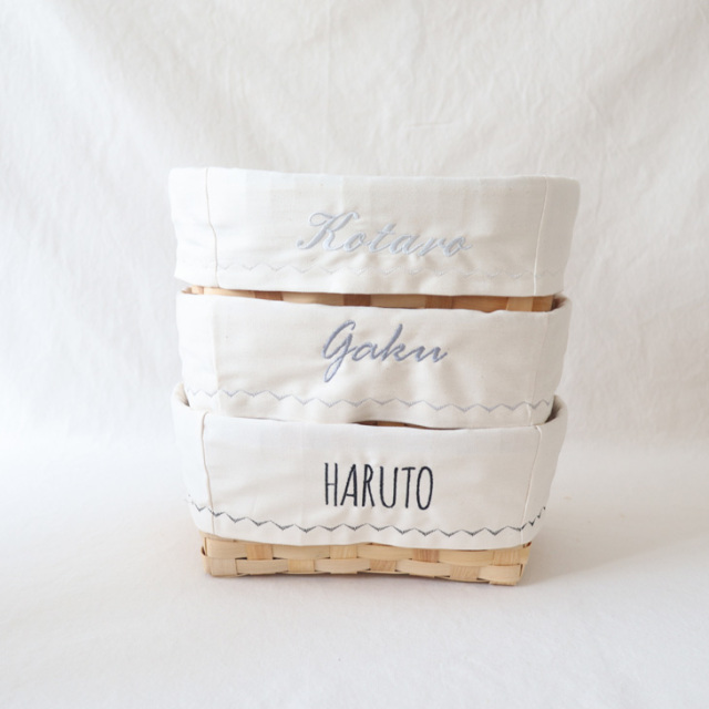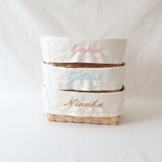 おむつ替えグッズやお着替え入れに使えるお名前刺繍入りバスケット。