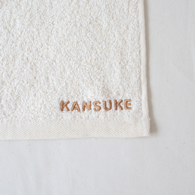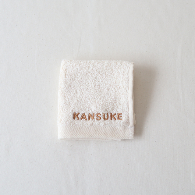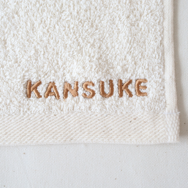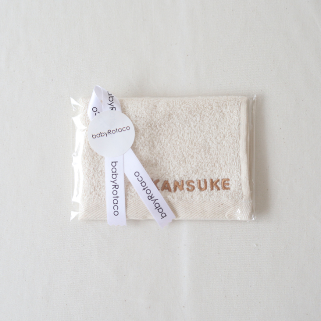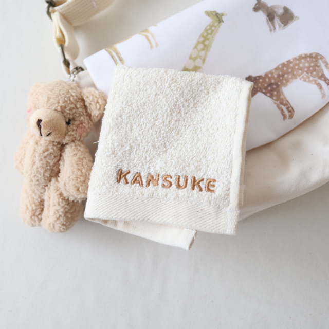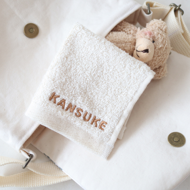 コロンとしたPOPなフォントの名入れ刺繍がかわいいハンカチタオル。
