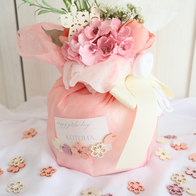 ひなまつり限定フラワーブーケ1段おむつケーキ。送料無料。[営業日朝10時までのご注文で当日発送]